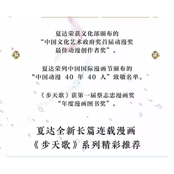 夏達,中國知名漫畫家,畫風細膩,氣質靈秀,別具一格,作品散發出中國古典飄逸雅致的文化底蘊。代表作長篇漫畫《長歌行》曾在中日同步連載,先後出版了中文簡/繁體版、日文版、法文版等6個語言版本的單行本,深受中外讀者喜愛。代表作《子不語》以生動形象的人物刻畫、優美細緻的背景、 的畫風,引發讀者共鳴,傳達了作者的美好希望。《步天歌》是夏達於2018年發表的全新全彩長篇連載作品,也是再踏征途的起航之作。古典醇熟的上色風格、縝密的編劇巧思、唯美的繪畫筆調,《步天歌》開啟天馬行空的想像,激勵一代人的成長。
