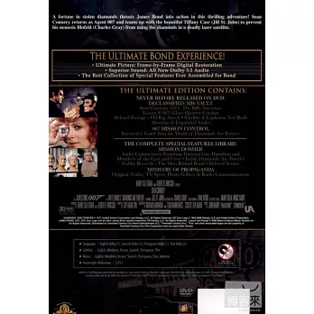 破解軍情六處(MI6)機密 史恩康納萊1971英國廣播公司BBC專訪 007課程-格鬥教育 遺珠片段-油井襲擊 衛星&爆破測試片段 多角度&分境片段 007任務追蹤-互動式導覽深入金鋼鑽 007任務檔案 導演和演員們隨片講評 直擊金剛鑽 007背後的推手 遺珠刪除畫面 直擊宣傳部 原始預告、電視廣告與影像資料庫