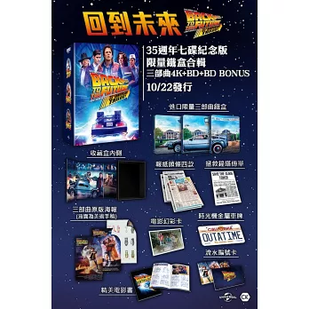 ※附贈時光機經典車牌、精美電影書、三部曲原版海報(背面為美術手稿)、報紙頭條四款、電影幻彩卡、拯救鐘塔傳單、流水編號卡