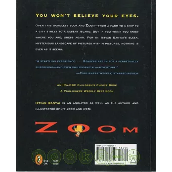Open this wordless book and zoom from a farm to a ship to a city street to a desert island. But if you think you know where you are, guess again. For nothing is ever as it seems in Istvan Banyai’s sleek, mysterious landscapes of pictures within pictures, which will tease and delight readers of all ages.