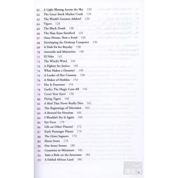 • 內容生動活潑,包括知識性文章:如〝Camel〞(第33篇)、〝Once Poison, Now a food〞(論馬鈴薯)、〝Altitude Sickness〞(爬山時注意事項);歷史性文章:如〝The Black Death(黑死病)〞、〝The Great Invasion(諾曼地登陸)〞;名人扶事,如〝The Wizard of Wall Street(華爾街大亨)〞;生物奇談,如〝The Whale Clan〞(鯨魚)、Monkey(猴子)〝Cockcroach(蟑螂)〞等有趣主題。