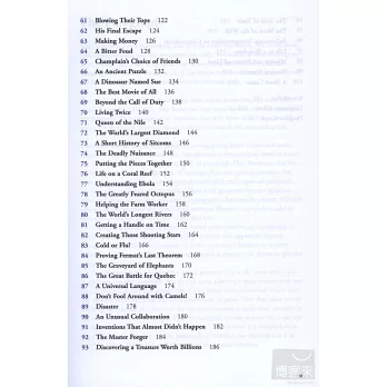 • 內容生動活潑,包括知識性文章:如〝Camel〞(第33篇)、〝Once Poison, Now a food〞(論馬鈴薯)、〝Altitude Sickness〞(爬山時注意事項);歷史性文章:如〝The Black Death(黑死病)〞、〝The Great Invasion(諾曼地登陸)〞;名人扶事,如〝The Wizard of Wall Street(華爾街大亨)〞;生物奇談,如〝The Whale Clan〞(鯨魚)、Monkey(猴子)〝Cockcroach(蟑螂)〞等有趣主題。