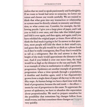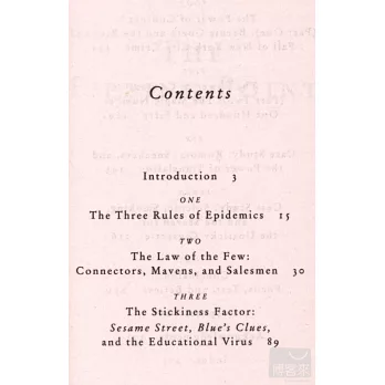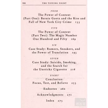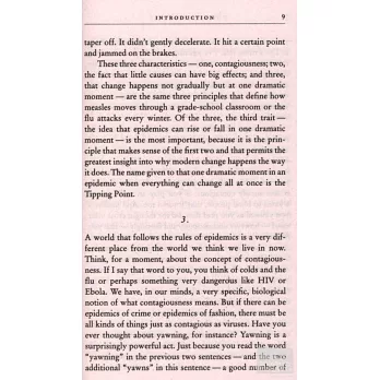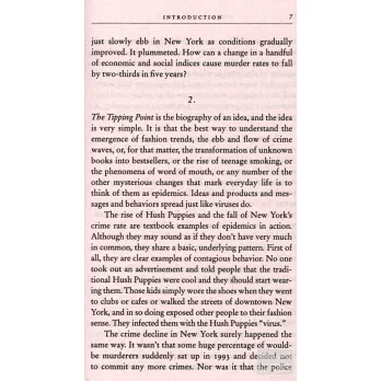 紐約市 1990 年代中期的犯罪率為什麼突然滑落?一位沒沒無名的小說作家為什麼突然竄升為暢銷書作家?青少年吸菸的風潮為什麼一發不可收拾?《芝麻街》這類電視節目為什麼能夠教導兒童閱讀?李佛(Paul Revere)示警為什麼這麼有效?