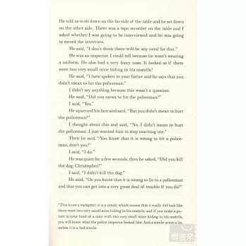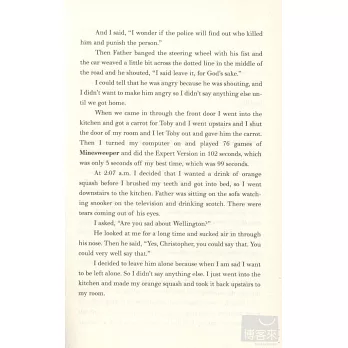 Christopher John Francis Boone knows all the countries of the world and their capitals and every prime number up to 7,057. He relates well to animals but has no understanding of human emotions. He cannot stand to be touched. Although gifted with a superbly logical brain, Christopher is autistic. Everyday interactions and admonishments have little meaning for him. Routine, order and predictability shelter him from the messy, wider world. Then, at fifteen, Christopher's carefully constructed world falls apart when he finds his neighbor's dog, Wellington, impaled on a garden fork, and he is initially blamed for the killing.