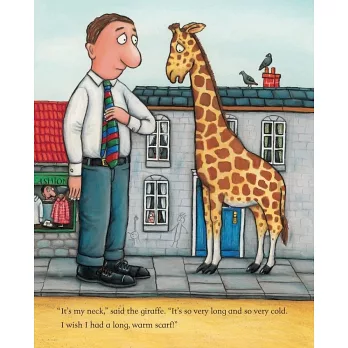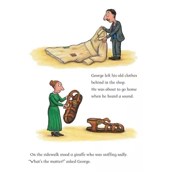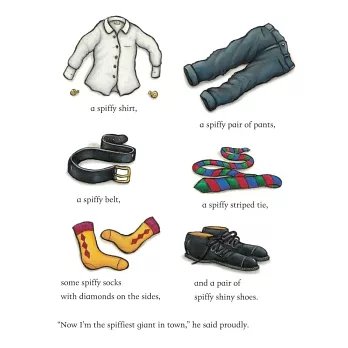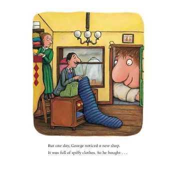 When George the giant spies a shop full of wonderful clothes, he decides to treat himself to a new outfit. He puts on his new shirt, pants, shoes, and tie, and is immediately transformed from the scruffiest giant in town to the spiffiest giant in town. But on his way home, George runs into various animals who need his help. And little by little, George finds himself giving away all his new purchases.
