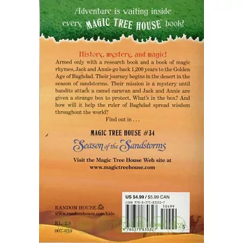 靠著一本參考書和一本魔法詩集,傑克和安妮回到了1200年前巴格達的黃金時代。他們降落在沙漠的綠洲上,跟著駱駝商隊前往巴格達,不幸的是,他們半路遇見了強盜的攻擊,有人把一個奇怪的盒子交給這對小兄妹,要他們用生命保護它。才剛躲開強盜,緊接著又遇上強烈的沙塵暴,傑克和安妮可以平安的到達巴格達嗎?他們能解開盒子的祕密嗎?