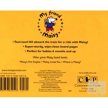 This attractive, shaped Maisy board book provides the perfect introduction to the theme of transport; it is die-cut in the shape of Maisy's bright green train and takes Maisy and all her friends on a journey through tunnels and up and down valleys.