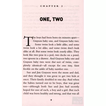 Identical twins Ray and Jay Grayson are moving to a new town. Again. But at least they'll have each other's company at their new school. Except, on the first day of sixth grade, Ray stays home sick, and Jay quickly discovers a major mistake: No one knows about his brother. Ray's not on the attendance lists and doesn't have a locker, or even a student folder. Jay decides that this lost information could be very...useful. And fun. Maybe even a little dangerous. As these two clever boys exploit a clerical oversight, each one discovers new perspectives on selfhood, friendship, and honesty.