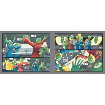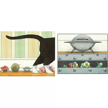 When the space visitors dodge the cat and take shelter behind the radiator to repair the damage, they make a host of insect friends. The result? A humorous exploration of cooperation between aliens and insects, and of the universal nature of communication involving symbols, "cave" paintings, and gestures of friendship.