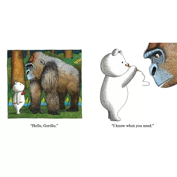 As bear strolls through the forest when he meets a lonely gorilla, a noisy crocodile, a lion and even an elephant. They all look like they need something, so bear steps in to save the day using his magic red and yellow pencil to draw just what they were looking for. Originally published in 1988 this early work by a picture book master is available again for a brand-new audience.