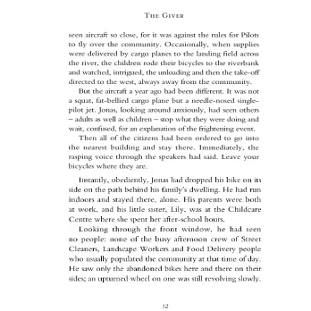 Life in the community where Jonas lives is idyllic. Designated birthmothers produce newchildren, who are assigned to appropriate family units. Citizens are assigned their partners and their jobs. No one thinks to ask questions. Everyone obeys. Everyone is the same. Except Jonas.