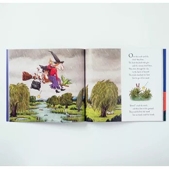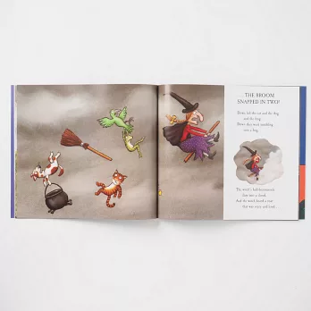 The witch and her cat fly happily over forests, rivers and mountains on their broomstick until a stormy wind blows away the witch's hat, bow and wand. Luckily, they are retrieved by a dog, a bird and a frog, who are all keen for a ride on the broom. It's a case of the more, the merrier, but the broomstick isn't used to such a heavy load and it's not long before... SNAP! It breaks in two! And with a greedy dragon looking for a snack, the witch's animal pals better think fast.