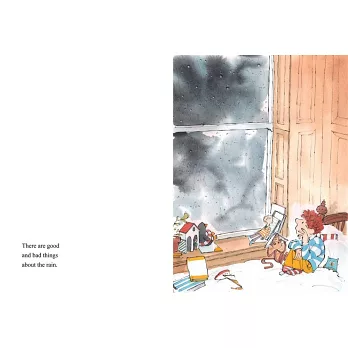 山姆.阿瑟著名的「季節系列」,以小男孩與爺爺在不同天候狀況下的冒險為主軸,分別描述在豔陽、強風、下雨、下雪四種天氣下兩人共度的奇妙經歷,而在每次冒險結束回到家後,兩人總是會在廚房對坐,分享這一天彼此的心得。比較特別的是,在這四部曲中的《下雨天》和《下雪天》,爺孫倆重複提到了「等 moreSam wants to go out but it's pouring with rain, so he and Grandpa decide to stay inside until the rain stops. Sam drinks hot chocolate and reads his books and dreams of adventures while Grandpa gets on with his important paperwork. Grandpa seems to have a VERY important letter to write. Then that very important letter has to be posted, despite the rain and floods. As they finally go outside, Sam and Grandpa have a magical adventure. Rain is the follow-up to the acclaimed Snow; and is the second title in a four-book series based on the weather.