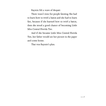 Raymie Clarke has a plan. If she can win the Little Miss Central Florida Tire competition, then her father, who left town two days ago with a dental hygienist, will see Raymie’s picture in the paper and (maybe) come home. To win, not only does Raymie have to do good deeds and learn how to twirl a baton, but she also has to contend with the wispy, frequently fainting Louisiana Elefante, who has a show-business background, and the fiery, stubborn Beverly Tapinski, who’s determined to sabotage the contest. As the competition approaches, loneliness, loss, and unanswerable questions draw the three girls into an unlikely friendship -- and challenge each of them to come to the rescue in unexpected ways.