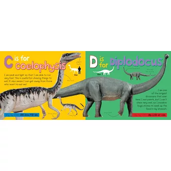 Each page of Dinosaur ABC focuses on a different dinosaur, from Allosaurus to Zephyrosaurus. There are large photographs of lifelike models, simple facts, infographics showing their sizes, and pronunciation guides. Dinosaur-mad kids will learn about some of their favorites, such as Triceratops and Diplodocus, and meet some they've never heard of before, such as Nodosaurus and Yingshanosaurus. The text is aimed at young readers, and the facts are easy to digest.