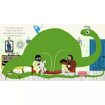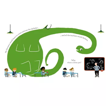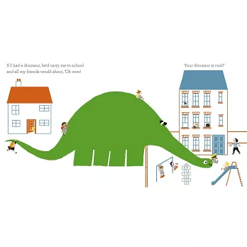 A little girl dreams of having her very own pet. But what kind of animal would make the best companion? A mouse is too small; a cat is too ordinary; and a fish is too… wet! As she plays with her toy dinosaur, inspiration strikes. What about a real, live dinosaur? She could ride it to school. It would need lots of food to eat, a swimming pool to drink from, and a dino flap so it could come and go. At the end of a day spent busily imagining, the girl trudges up to bed with her little plastic dinosaur. As she falls asleep, the dinosaur from her daydreams stands in the garden with its head poking through the bedroom window, making her dreams come true.