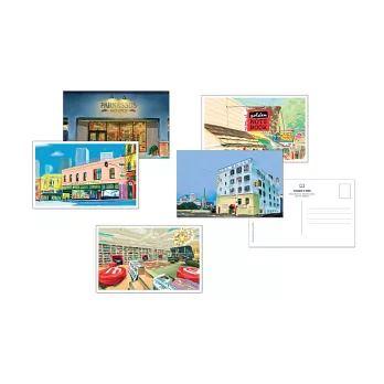 Celebrating beloved bookshops and the people who work in them, each of these postcards includes a painterly illustration with the name and dates of operation and room for writing on the back, offering a charming dedication to the world of books.