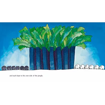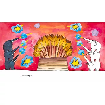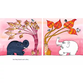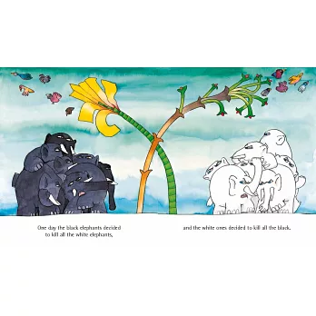 Once, elephants came in two colors: black or white. They loved all other creatures—but each set wanted to destroy the other. Peace-loving elephants ran and hid in the deepest jungle while battle commenced. The war-mongers succeeded: for a long time it seemed that there were no elephants in the world at all, not of any color. But then the descendants of the peace-loving ones emerged from the jungle, and by now they were all grey.