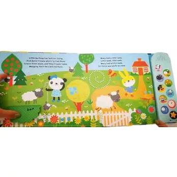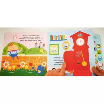 最超值的英文經典童謠大合輯,收錄Humpty Dumpty、Little Bo-Peep 和 Twinkle、Twinkle Little Star等多首曲目。嬰幼兒也方便操作的按鈕,讓寶貝隨按隨聽,跟著一起唱歌。材質堅固的硬頁書,內有多個翻翻機關、不同觸感材質,讓寶貝邊聽邊玩,開心探索!