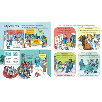下一頁可以看見病人看診的情形,有氣喘病人正在使用呼吸器,有人在檢查視力,還有人正在手術房開刀呢。走到醫院大廳一看,形形色色的人們各忙各的,領藥、結帳、候診,擁擠的人群將醫院擠得水洩不通,忙碌極了。再往醫院走,可以看到複雜的醫檢機器,磁陣造影的機器、超音波機器、尿液檢查,連細菌培養都有詳細的介紹,當然,手術室、甚至是產房等各項設備也都沒有錯過,滿足小朋友一窺醫院的好奇心。