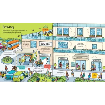 《Look Inside a Hospital》翻翻書以大開本的尺寸,詳細的繪圖與文字說明介紹醫院的設備與流程。翻開第一頁,救護車抵達醫院,病患被火速送進急診室,24小時開放的急診室為病患緊急處理各種疑難雜症,是醫院的第一道大門。
