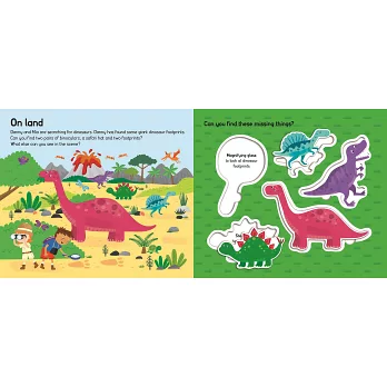 本書包含海洋、陸地和天空3大場景、15個遊戲配件,寶貝們可以運用配件,扮演探險家,找一找恐龍在哪裡。數數看,總共有幾隻恐龍呢?再試試看,把不同種類的恐龍拼圖,放入書中相對應的位置,你能順利完成配對拼圖遊戲嗎?