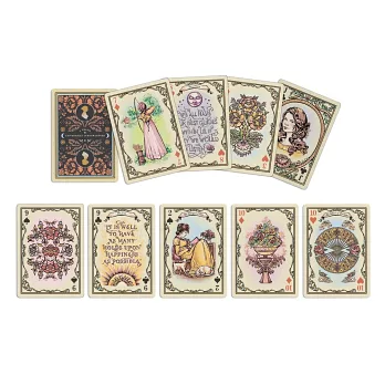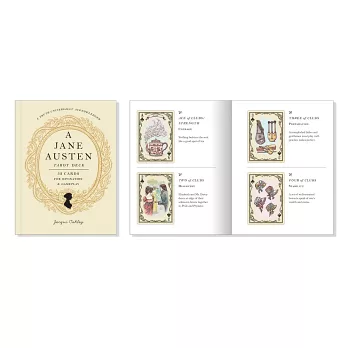 Noted Jane Austen artist Jacqui Oakley brings her beautiful work to the world of tarot with this sublime and whimsical package. Featuring 53 characters (including Elizabeth Bennet, Mr. Darcy, Elinor Dashwood, and more) and objects (such as well-trimmed bonnets and a stack of novels) from Austen's books, each card doubles as a playing card and tarot card. With Mr. Wickham from Pride and Prejudice as the Devil, a teapot representing strength, and Austen herself as the Magician, it's perfect for both longtime and new Austen fans. Oversized, sleek, and sophisticated, this deck comes in a hinged cigar box decorated with foil stamping and a wafer seal enclosure, and is accompanied by a booklet containing a brief overview of tarot and a guide to the cards and the world of Austen.