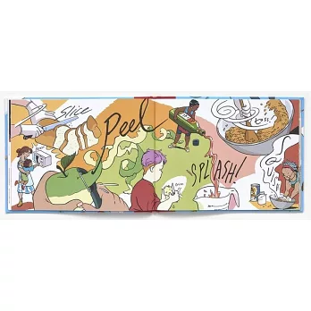 玉木吉莉安以鋼筆勾勒輪廓,再用電腦繪圖上色,自由明快的線條、大面積的亮麗色彩,加上大量的對話泡泡框,以及象徵味道與熱氣的漩渦狀曲線,組成一幅幅極具戲劇性與臨場感的動態場景,讓人彷彿聽見了忙碌的煮飯聲,聞到了陣陣的飯菜香,並且感受到廚房暖呼呼的熱度,使原本平面的畫面,頓時立體鮮活了起來!書裡還另外提供兩道簡易食譜,圖文並茂的呈現蔬菜湯和奶酥蘋果派的作法。
