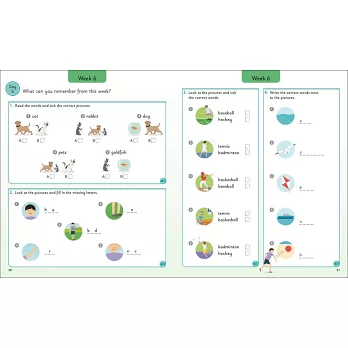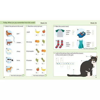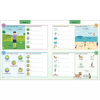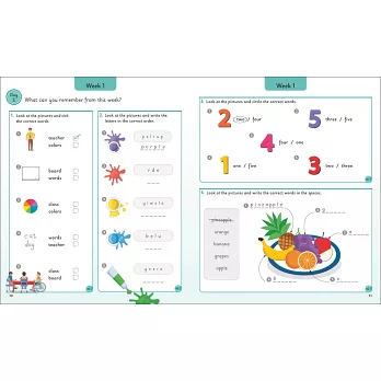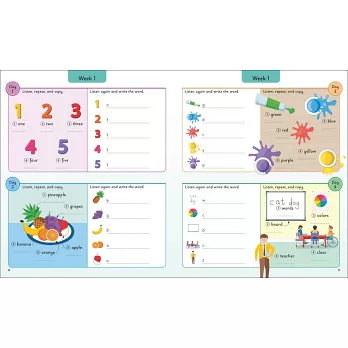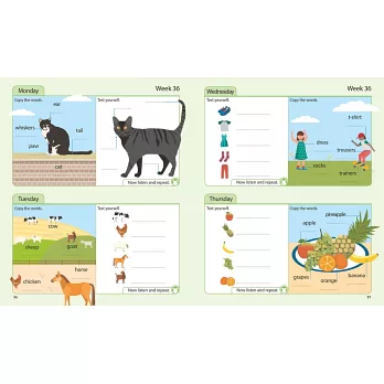 DK出版社這本精美的《English for Everyone Junior 5 Words a Day》英語學習書,以週為單位,一週五天每天帶孩子學習5個實用的生活單字:週一到週四學習單字,週五透過各式互動遊戲與練習,增強單字記憶力,學習主題包括各式各樣的生活單字,從顏色、數字、水果、玩具、動物、體育活動、衣服到天氣都有,而且除了精緻的全彩繪圖外,還附有音檔,讓孩子邊聽邊學習。