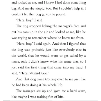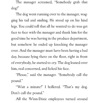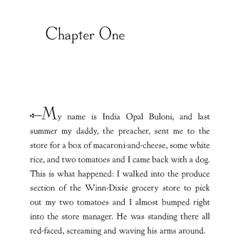 One summer’s day, ten-year-old India Opal Buloni goes down to the local supermarket for some groceries--and comes home with a dog. But Winn-Dixie is no ordinary dog. It’s because of Winn-Dixie that Opal begins to make friends. And it’s because of Winn-Dixie that she finally dares to ask her father about her mother, who left when Opal was three. In fact, as Opal admits, just about everything that happens that summer is because of Winn-Dixie. "This book is (I hope) a hymn of praise to dogs, friendship, and the South," Kate DiCamillo said of her best-selling debut novel, which has been awarded a Newbery Honor, translated into nearly thirty languages, and turned into a major motion picture. The story of a preacher’s daughter named Opal whose life is transformed by a scruffy dog named Winn-Dixie continues to touch the hearts of readers of all ages.