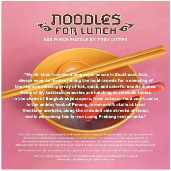 The Noodles for Lunch 500 Piece Jigsaw Puzzle features 35 colorful images of tasty noodle dishes from Southeast Asia, all photographed (and eaten!) by designer and world traveler Troy Litten. The mesmerizing palette of bowls, chopsticks, spoons, spices and tabletops makes this puzzle a delicious challenge best tackled on a full stomach. An insert of the puzzle image with information about Troy Litten is included. Galison puzzles are packaged in matte-finish sturdy boxes, perfect for gifting, reuse, and storage. - 500 pieces - Box Size: 8 x 8 x 2, 203 x 203 x 51 mm - Puzzle Size: 20 x 20, 508 x 508 mm - Ribbon Cut Pieces - Includes Insert