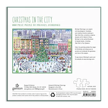 Award-winning designer, illustrator, and creative director Michael Storrings captures the magic of the holiday in the city with ice skaters, a Christmas tree several stories tall with brightly lit buildings and skyscrapers lighting the scene. Galison puzzles are packaged in matte-finish sturdy boxes, perfect for gifting, reuse, and storage. An insert of the full puzzle image is also included. - 1000 Pieces, Ribbon Cut - Puzzle Dimensions: 20 x 27", 508 x 686mm - Box Dimensions: 8 x 8 x 1.5", 203 x 203 x 31mm - Contains informational insert about artist and image - Minimal Puzzle Dust
