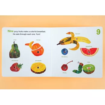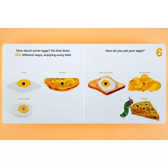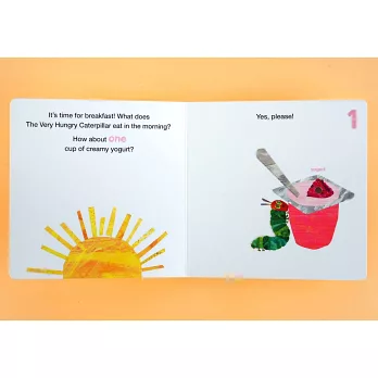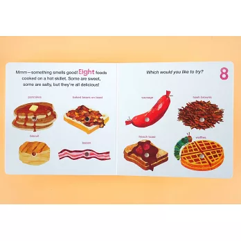 跟著《好餓的毛毛蟲》一起吃牠一天中最愛的早餐,數一數桌上有哪些驚喜!優格、雞蛋、水果、鬆餅、煎餅到吐司,孩子最喜歡且熟悉的早餐都成了有趣的數字遊戲。
