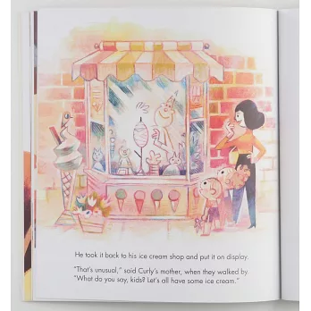 插畫家馬修.佛賽混用不透明水彩、彩色墨水和鉛筆,畫出可愛討喜的人物造型,粉嫩甜美的棉花糖色調,營造出濃濃的復古懷舊的風格。故事開頭和結尾(包括蝴蝶頁)都以冰淇淋來呈現,更讓整本書散發出香甜迷人的氛圍。