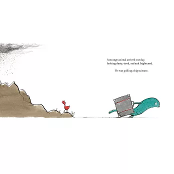 有一天,一隻長相奇特的陌生動物拖著一個大大的行李箱,翻山越嶺來到這裡,引起其他動物的關切與好奇:他為什麼到這裡來?他從什麼地方來?行李箱裡面到底有什麼?這隻動物回答,他的箱子裡有一個茶杯、一張桌子、一把椅子,他說他從很遠很遠的地方來,走了很久很久的路,很累很累了,需要休息一下。就在這隻筋疲力盡的動物沉睡時,小鳥、兔子、狐狸對他和他的箱子議論紛紛,大家實在無法相信他所說的話,於是,狐狸動手打開了行李箱……