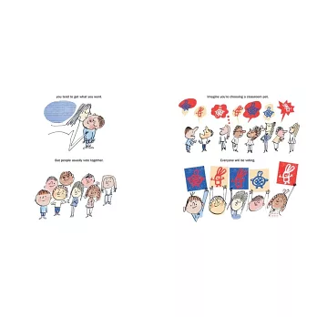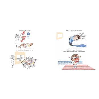 這本繪本用最平易近人的方式,帶孩子從生活事例看懂投票和選舉。先從孩子喜歡的食物開始,點出選擇和投票的關聯,接著延伸到當大家必須一起做選擇時,要如何表達想法、爭取支持、仔細衡量資訊,並以理性接納結果。最後再利用同樣的核心概念介紹大人的選舉,同時也告訴孩子即使沒有投票權,還是有自己參與的方式。書末並附有臺灣選舉方式及政府組織的相關介紹,讓孩子更清楚選舉前後可以關注那些事。