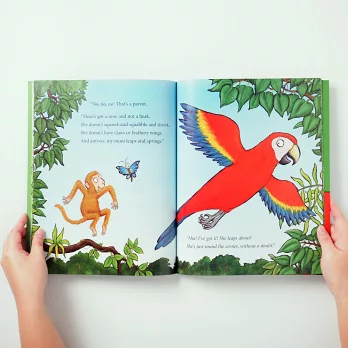 但是,經過一次又一次的尋找……「她的尾巴可以纏住樹幹?」「我媽媽有腿。」「她寧願吃水果,也不要吞蒼蠅,而且她住在高高的樹頂。」