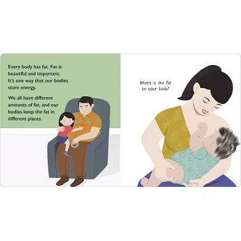 這本以「身體」為主題的書,以簡單英文問答,背景知識,提供常見的生活情境下多角度思考,讓親子開啟更深入的對話,例如其中提到「脂肪」的用途、「媒體呈現的身體謬誤」等。引領孩子欣賞所有身體的獨特面向,並探討世間對於身體不公平的規則和想法。