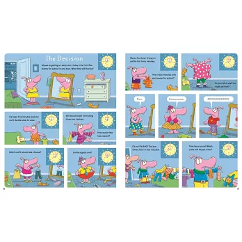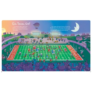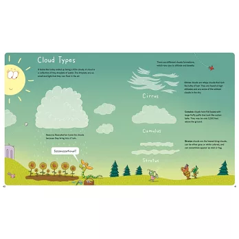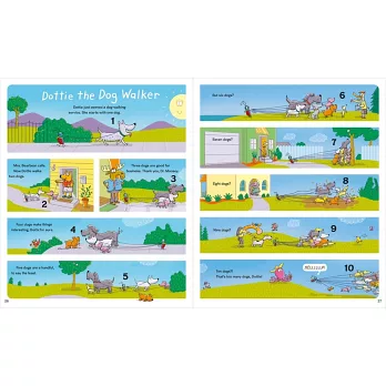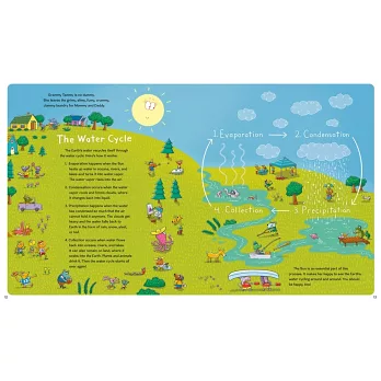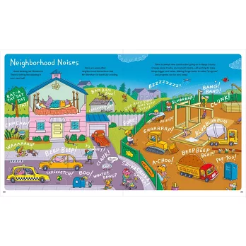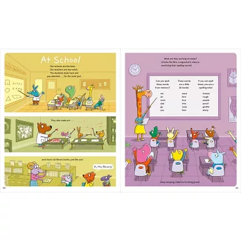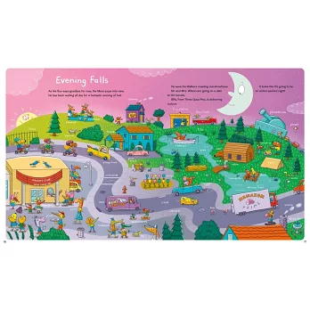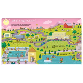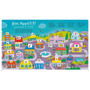 四季、天氣、交通工具、認識時間、簡易科普知識等。此外,生動的圖畫中附有相關的英文單字,適合引導小讀者跟著圖片,視覺記憶常用的英文單字,並可以透過角色的對話,熟悉日常英文對話句型。豐富的圖畫細節,讓孩子可以盡情觀察和探索,邊讀邊玩邊學,帶來豐富收穫。如果你家孩子喜歡理察.斯凱瑞(Richard Scarry)《好忙好忙的小鎮》等作品,相信他也會喜歡Happy County!