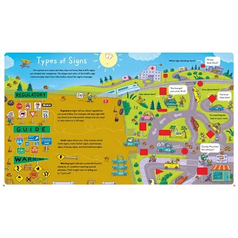 快樂郡忙碌的道路上擠滿了各種車,有汽車、卡車、公車、自行車和許多標誌。小讀者跟著可愛的角色,一起認識日常生活中常看到的有趣交通工具、道路、地圖和地理等知識。