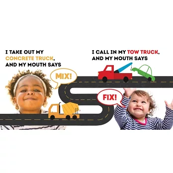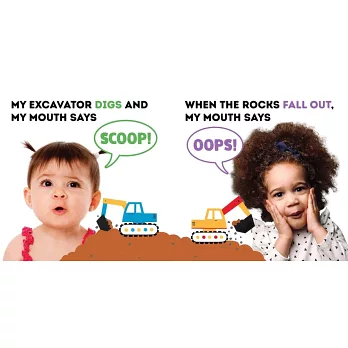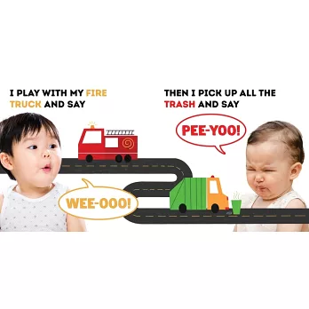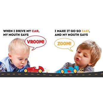 家長可以簡單的英文問句,如:「When I drive my Car, my mouth says」,引導孩子接著說出「Zoom」這個狀聲詞。而書中圖片裡的寶寶也會呈現發出該狀聲詞的嘴型,讓孩子易於模仿,進而熟悉英文的發聲、學習說話。