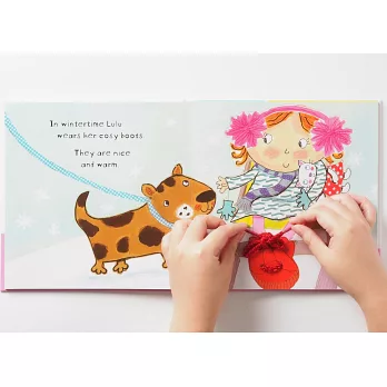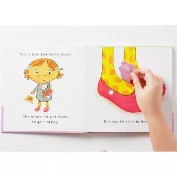 露露很喜歡她的鞋子,今天她穿上粉紅色的鞋子出門了,你可以幫露露繫上她的鞋帶嗎?天氣冷時,露露會穿上溫暖的靴子,夏天去海邊的時候,露露就會穿上她那雙可愛的花花夾腳拖,而露露覺得穿起來最舒服的鞋子就是她平常在家穿的那雙毛茸茸室內拖鞋,你可以摸摸看露露的鞋子,摸起來是不是很舒服呢?不過這些都不是露露最喜歡的鞋子,你知道露露最喜歡的鞋子是哪一雙嗎?