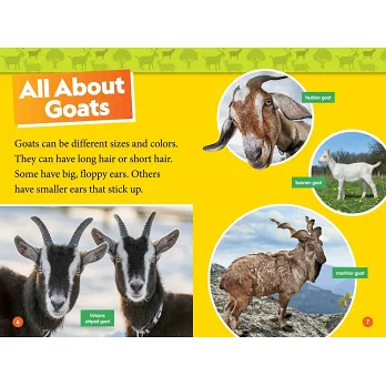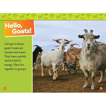 "This Level 1 Reader introduces kids to the different goats of the world. From the furry Angora goat to the Grison’s striped goat, early readers discover a goat’s different body parts from their horns to their hooves to their amazing abilities to climb rocky cliffs and hop from rock to rock! This book is a great introduction to the biology of these adorable furry animals! National Geographic Readers’ combination of expert-vetted text, brilliant images, and a fun approach to reading have proved to be a winning formula with kids, parents, and educators. This level 1 text provides accessible information for kids just beginning to read on their own, perfect to encourage the scientists and explorers of tomorrow!" --]cPublisher marketing.