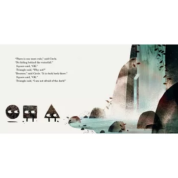 三角形和正方形一起去找圓形玩,大家說好來玩躲貓貓,圓形宣布,這個遊戲有個規則,那就是絕對不要跑到瀑布後面!遊戲開始,圓形閉上眼睛數到十,三角形就趁著機會,偷跑進了那個不能去的地方……圓形嘆氣,無奈的走進瀑布。「三角形,三角形,你在哪裡?」走進神秘禁區,裡頭一片漆黑,這時出現了一對眼睛,是誰鬼鬼祟祟的藏在裡頭?圓形能成功找到三角形嗎?