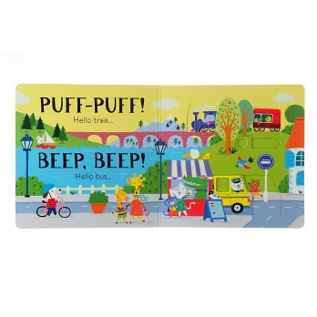 Move the sliders back and forth to hear the different vehicles zooming along in this unique and exciting sound book. When you move a slider one way you'll see and hear one vehicle... and when you move it back the other way you'll see and hear another one. There are planes, trains, cars, motorbikes and buses to discover, all driven by Ailie Busby's charming animal characters.