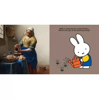 這本書適合作為小讀者親近藝術世界的入門書,將米飛兔的圖畫對照維梅爾作品中的相似畫面,並以容易理解的提問方式引導孩子觀察和思考。在可愛的米飛兔陪伴下,一起欣賞維梅爾的畫作,發現兩位藝術家之間有趣的相同和不同之處吧!