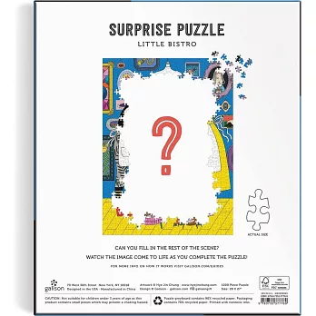 Little Bistro 1000 Piece Surprise Puzzle from Galison features a restaurant-themed surprise image. Some elements are presented on the box and the insert, but the complete scene emerges as the puzzle is assembled for a truly one-of-a-kind puzzling experience. Galison puzzles are packaged in matte-finish sturdy boxes, perfect for gifting, reuse, and storage. An insert of the full puzzle image is also included.