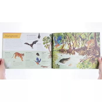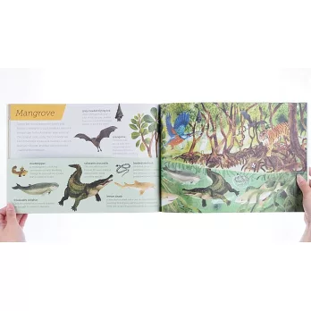 切割成上下頁的翻書設計,讓孩子盡情翻看、尋找海面上下的新奇事物。從陽光普照的沙灘到最黑暗的海底深處,《Above and Below: Sea and Shore》帶小小讀者徜徉兩種世界,紅樹林、珊瑚礁、河口生物甚至是極地海洋與深海,全都一覽無遺。