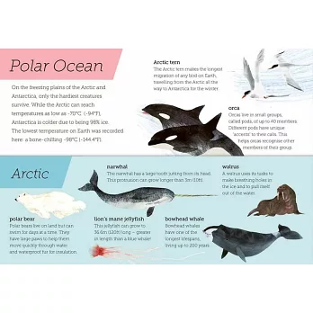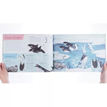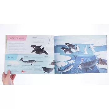 除了色彩繽紛的豐富圖像,書中也詳細介紹不同棲地的各種生物,像是在極地生活的虎鯨、北極燕鷗,或是珊瑚礁生態系的海扇、河豚,兩種視角呈現出不同生態圈動、植物悠遊、生長的場景,再搭配上詳細又生動的文字說明,極富教育意義,是讓孩子了解自然生態的最佳繪本書。
