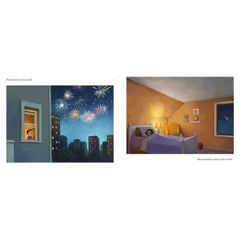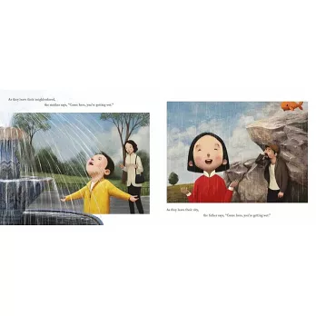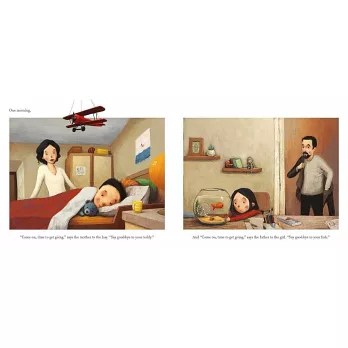 左、右兩條平行的故事線,敘述身處在不同城市、兩個家庭的命運——左頁的男孩被媽媽叫醒,展開平凡快樂的小旅行,當男孩回到家時,他的泰迪熊玩偶還會在原來的位置等著抱抱,一如往常。同時,右頁的女孩被爸爸叫醒,他們不得不離開原本住的地方,當她和寵物金魚說再見時,恐怕還不知道曾經擁有的家園,終將成為日漸模糊的記憶‥‥